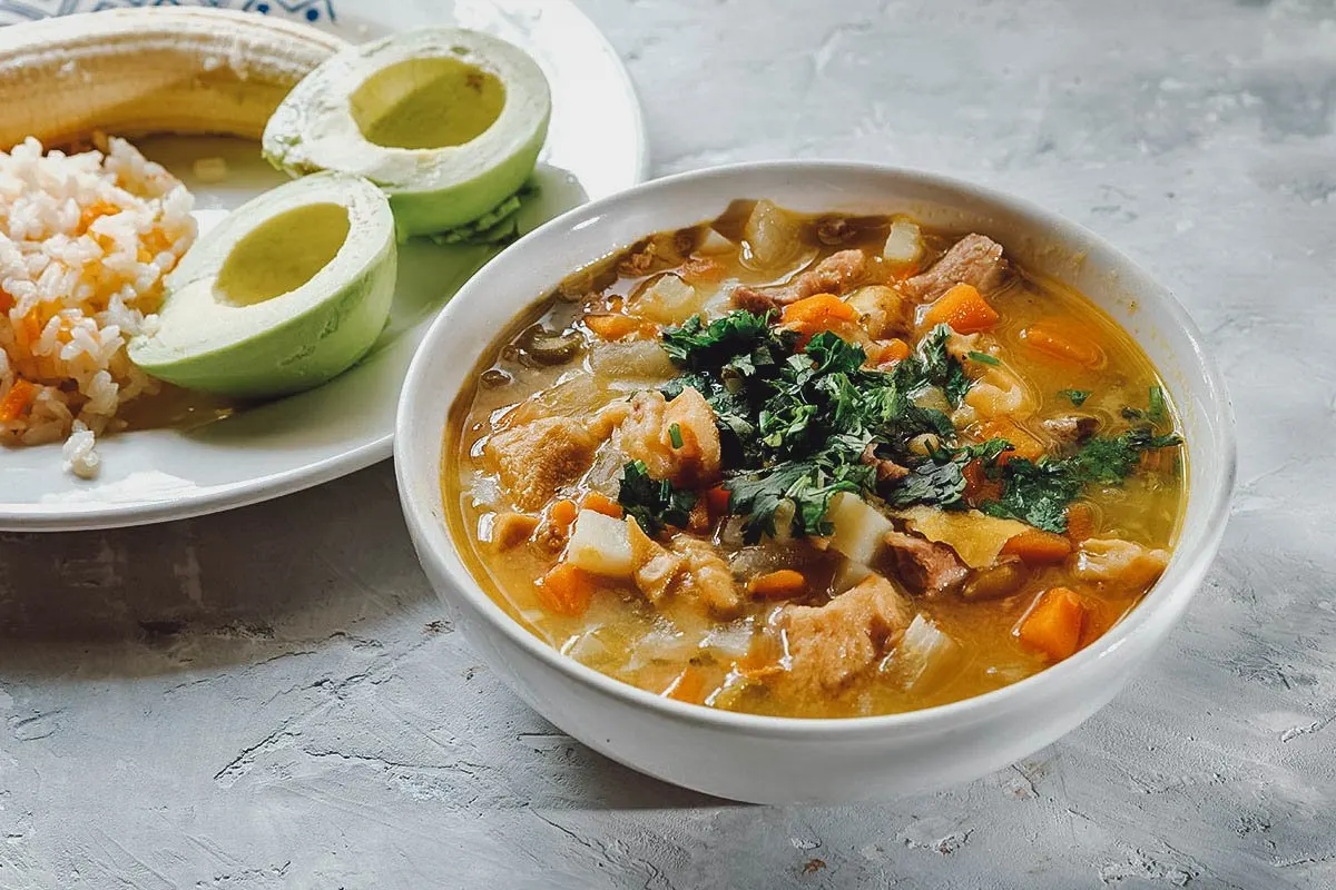 Sancocho can be prepared in different ways but it’s typically made with large chunks of meat, vegetables, and tubers served in a broth. In Colombia, it’s commonly made with chicken, pork or beef ribs, fish, or ox tail.