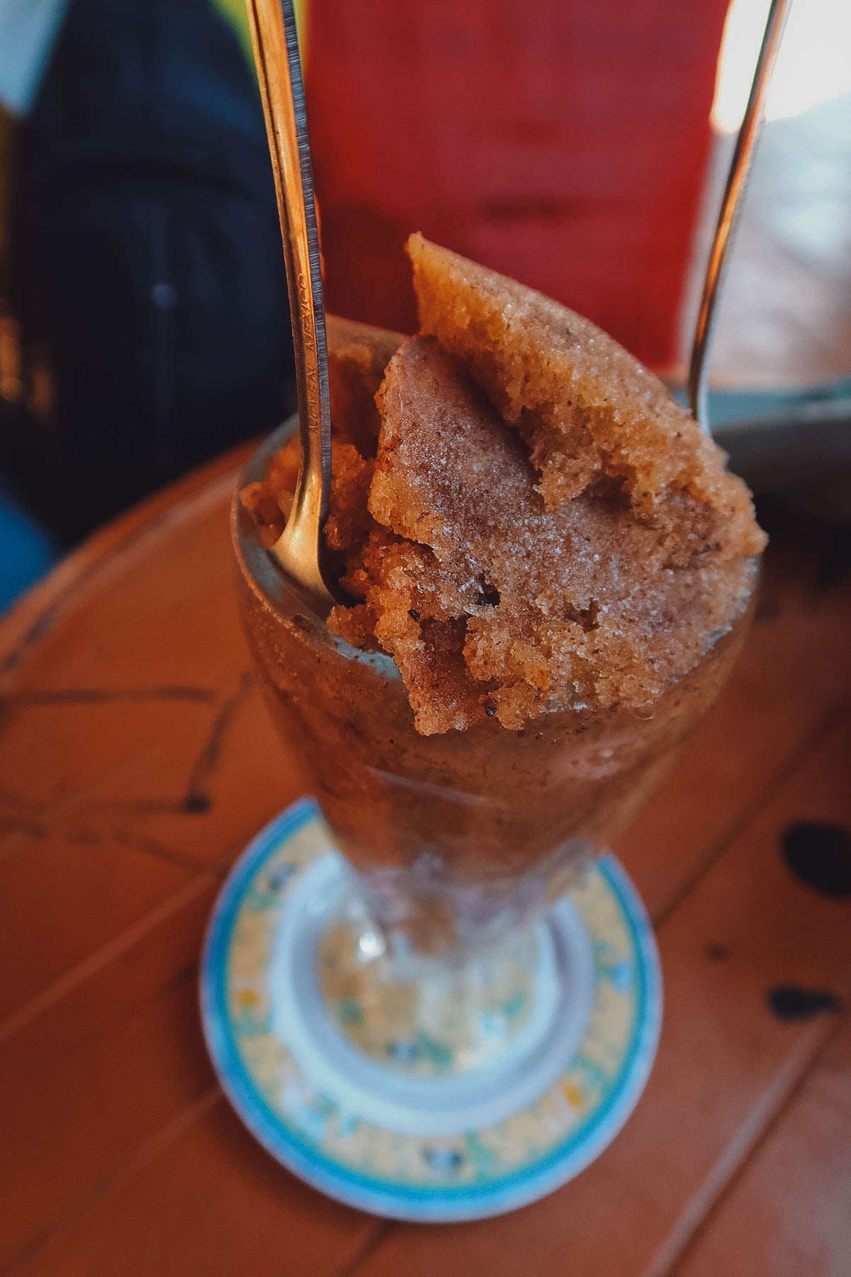 When we ordered this, I assumed they’d sprinkle the ice cream with chapulines but they actually grind them into the nieves. You can’t see the grasshoppers at all but you can definitely taste them. The ice cream is sweet, salty, tangy, savory, and spicy all at once. It’s strange but it works!