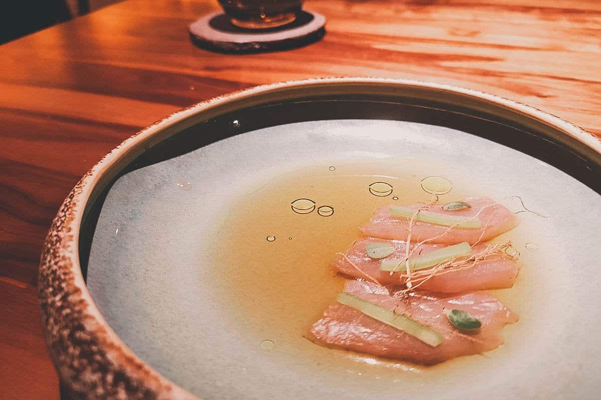 I really enjoyed the texture of this one. Called Cure Me (mackerel, mushroom, cilantro), it consists of cured mackerel served with mushroom and cilantro in a light broth.