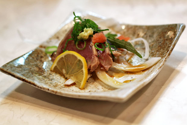 If I remember correctly, Tom said that they serve a starter dish to every customer. Tonight, it was seared katsuo (bonito).