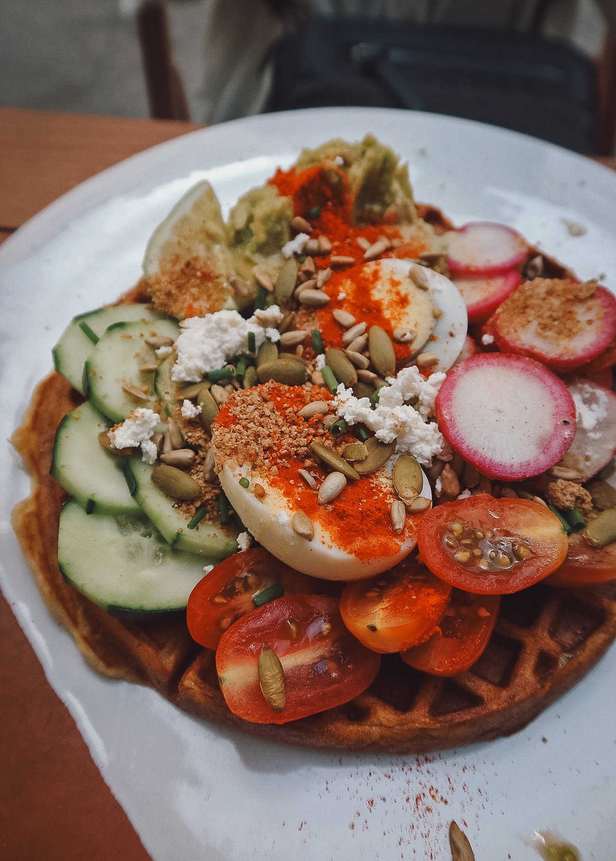 What you’re looking at here is their sweet potato waffle. More a savory dish than sweet, it’s topped with cherry tomatoes, guacamole, cucumber, radish, and a hard-boiled egg.